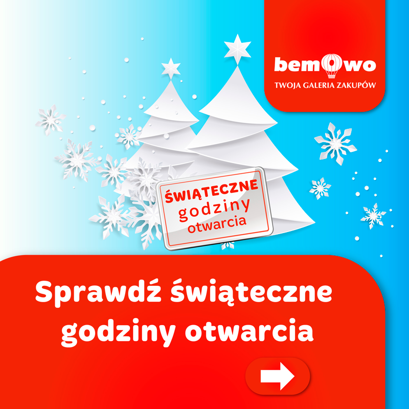 Szanowni Państwo, zapraszamy do zapoznania się z godzinami otwarcia Galerii Bemowo w okresie świąteczno-noworocznym.